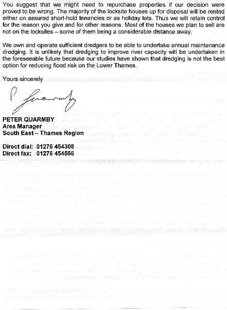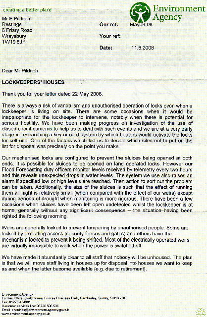 No. 5 "Most of the houses we plan to sell are not on lock-sites...” The comment on choice of sites not to be disposed of leaves me a little puzzled. What is the criteria ? Old Windsor, Bell Weir and Penton Hook will go on the market – each is slightly remote and response from the EA and the police is unlikely to be immediate. Much the same is probably true of most locks.
