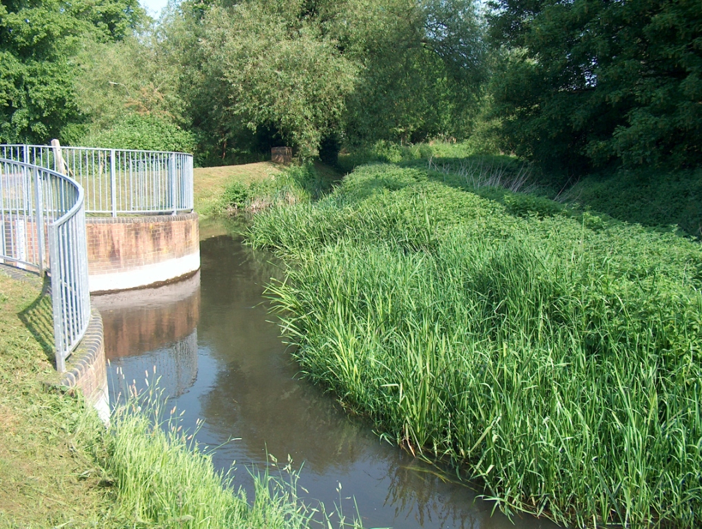 Below is is a view upstream of the Moor Lane off-take in Staines taken on 25/5/2010. The off-take flow control structure is to the left and enables flood water to by-pass the downstream section of the river.. It appears that the conveyance capacity of the Wraysbury River is now severely limited due to unrestrained weed growth over 75% of the channel width Please note that although the left-hand flood bank is beautifully mown, the EA appears unable to maintain the watercourse.