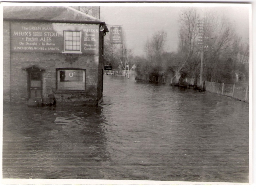 1947 flood - The Green Man, Station Road with 2009 image below >