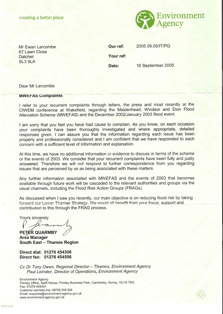 The Jubilee River story - Peter Quarmby letter - September 2005