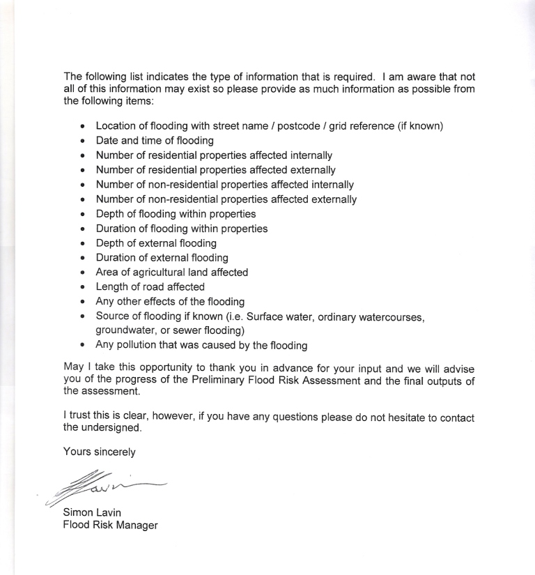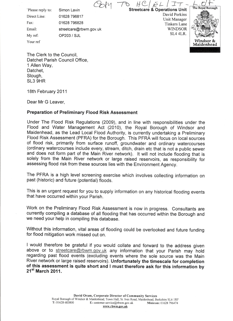 The Flood Risk Regulations 2009 and the FWMA 2010 have resulted in the Royal Borough of Windsor and Maidenhead requesting information about past flood events (excluding main river and reservoir flooding) as a matter of urgency.