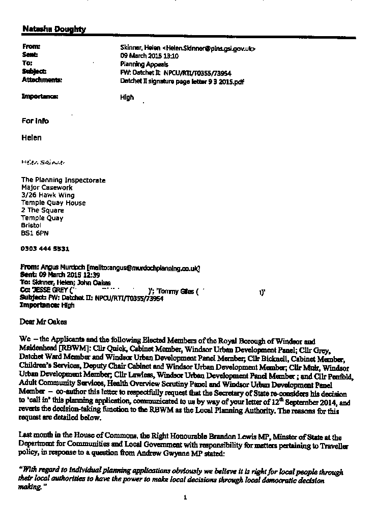 Below is a copy of page 1 of a letter from the applicants and signed by some RBWM Councillors requesting that the Secretary of State reconsiders his decision to 'call in' the planning application. In particular you will note that Cllrs. Bicknell, Grey and Muir all signed the document. The original seven page document may be found on the RBWM Planning web site.