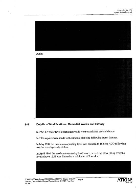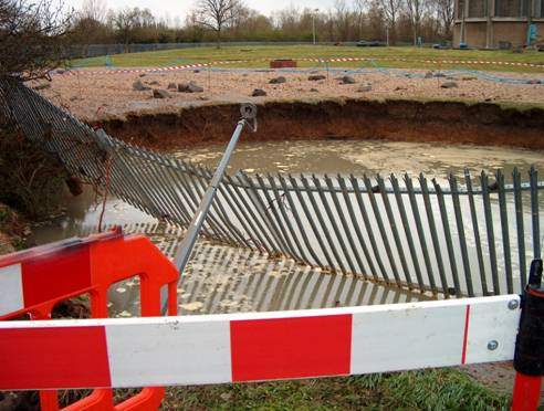 April 2006 – Horton Road, Datchet, Berkshire – an 8 foot (2,400 mm) diameter water pipe 30m below ground level burst at the foot of the 30m high reservoir embankment. Homes were flooded and the road collapsed, but luckily the reservoir embankment was not breached. (Please see photographs and map below)