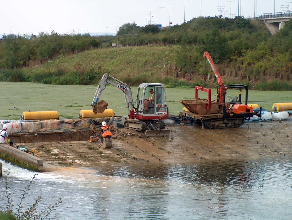 Slough Weir - Repairs underway (Sept 2005)(note algae upstream)