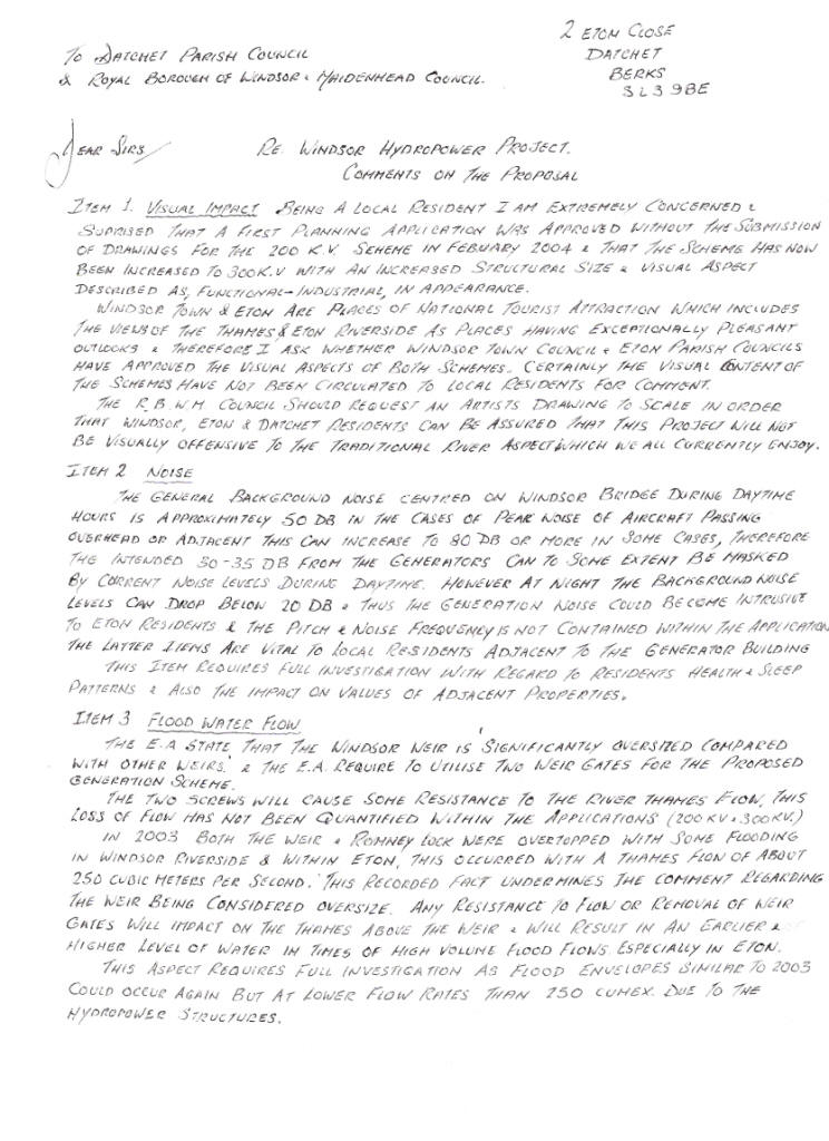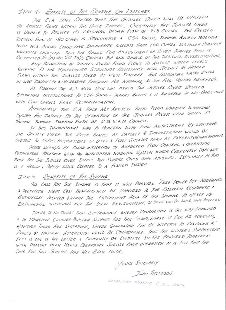 Letter to Datchet Parish Council from Ian Thompson of Datchet